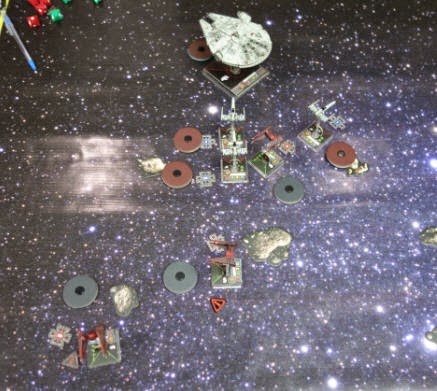 Now in formation, my mini-swarm zipped back to action and closed the distance to the Falcon who is being harried by both of the remaining Interceptors. The flanking royal guard followed the YT-1300 and ended up on its rear at Range 1. Chewie barely missed an asteroid with a hairline's width. Some flying. The squint on the right was able to strip the shields on the lead Z-95 while the other dropped further damage to Chewie's hull but still not enough to finish it. My return fire destroyed the trailing Interceptor much to more of my opponent's unlucky rolling (zero evades on four defense dice!).